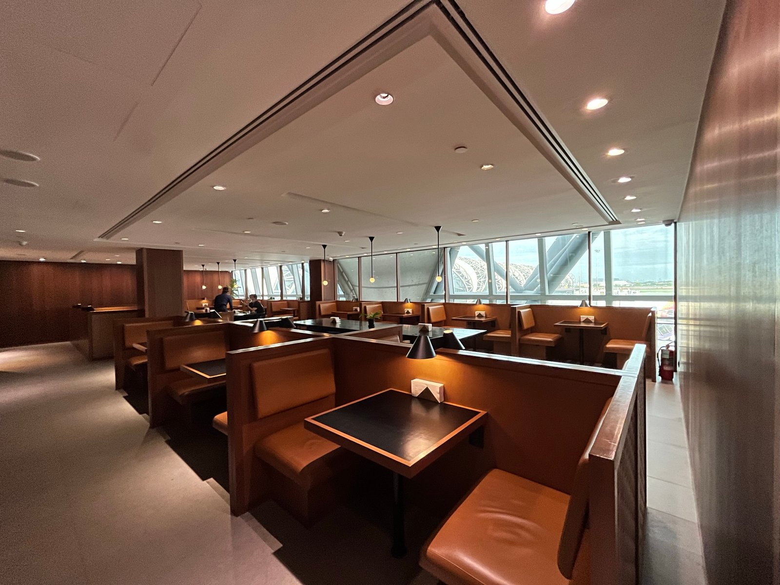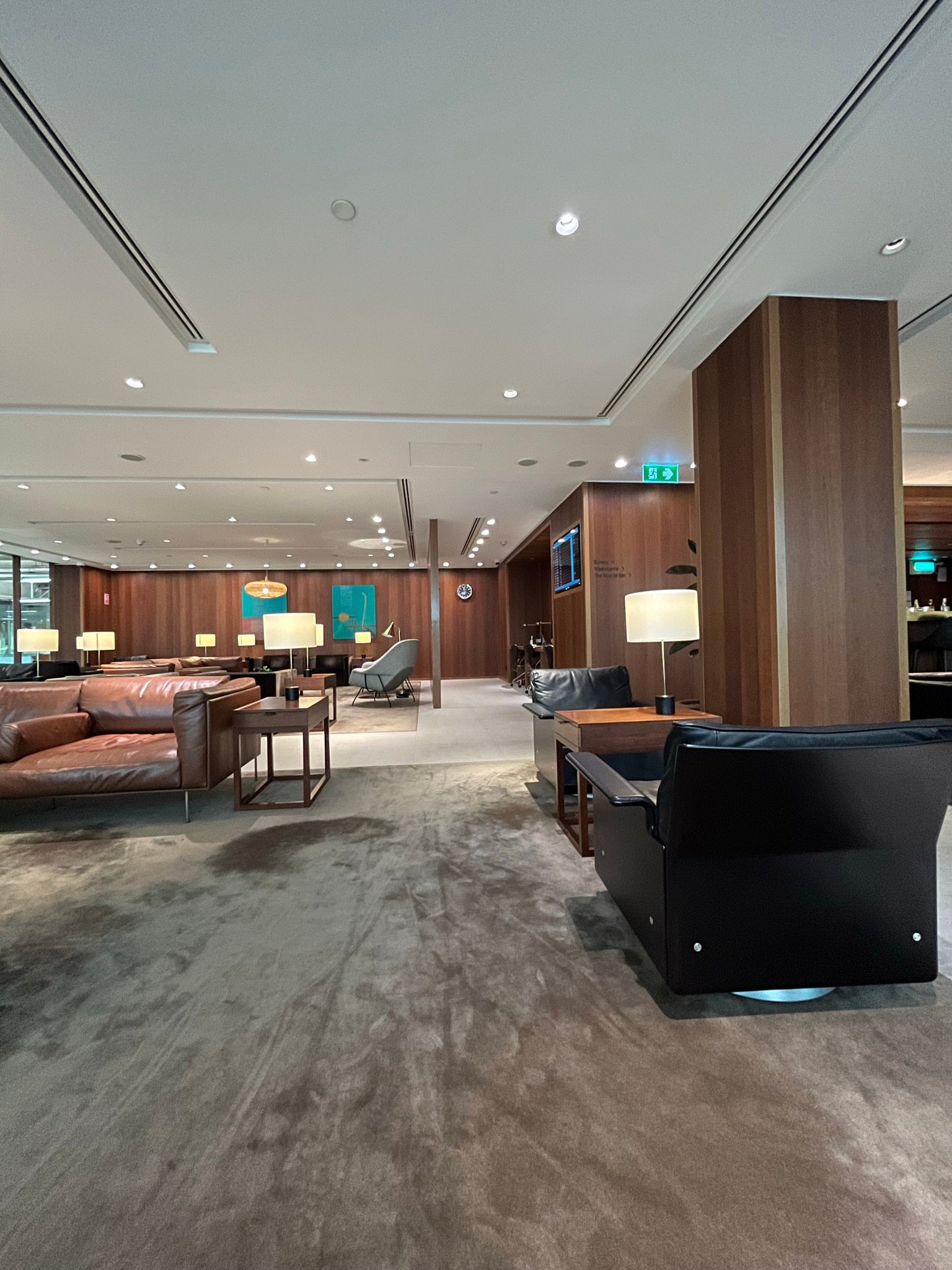 There are plenty of different spaces to grab a seat, as well as ample charging sockets (which extend out from the side tables). My favourite seats are those in front of the floor to ceiling windows. Here you’ll get a great view of the airport, and if you enjoy a bit of planespotting, it’s a nice place to be.
