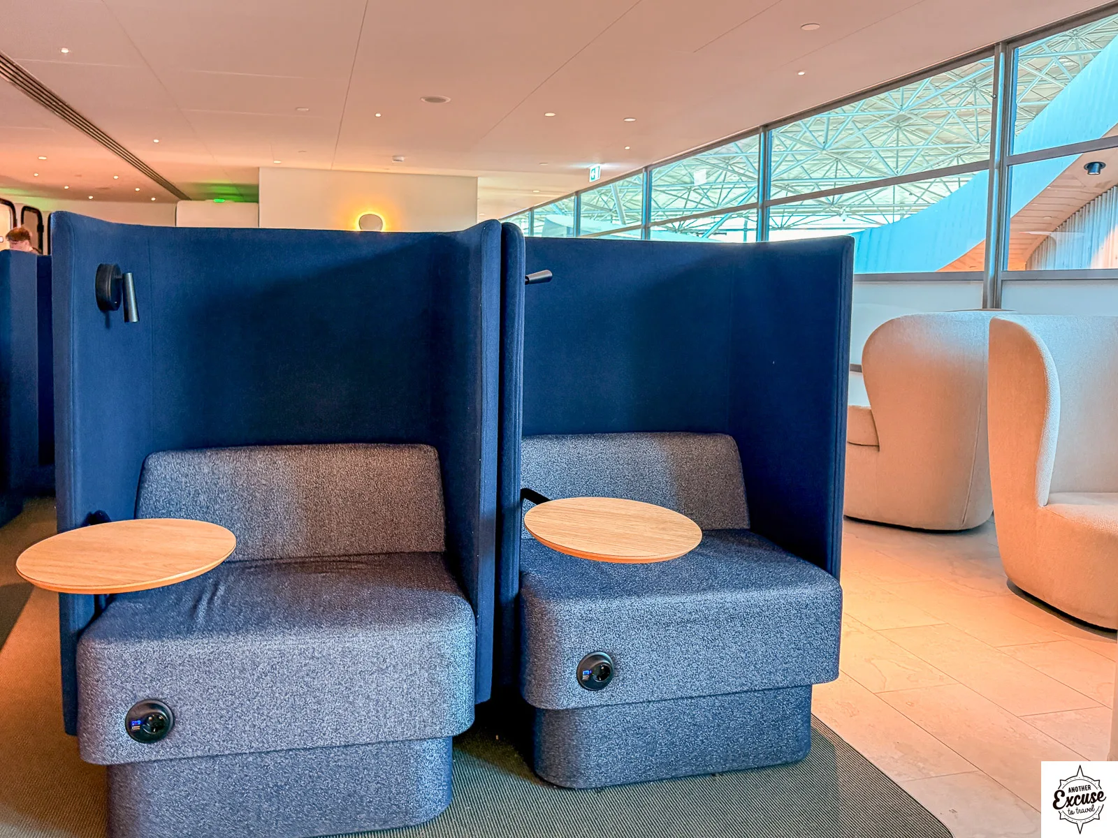 In the space at the back of the lounge you’ll find rows of workpod style armchairs. I personally found them slightly claustrophobic. This isn’t helped by the general darkness of the adjacent area. While there are windows, they look out onto the main airport concourse, and there isn’t a huge deal of natural light.