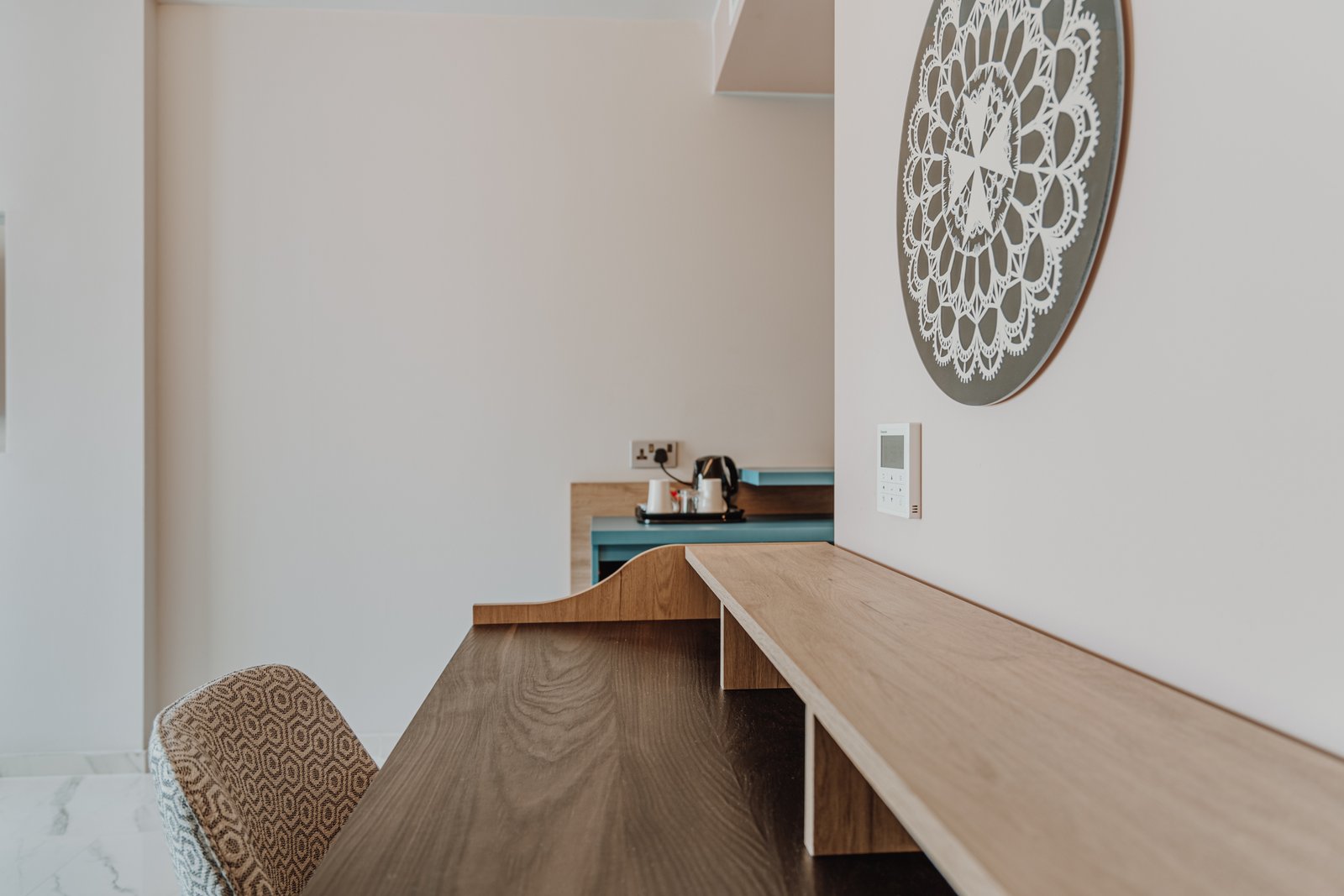 The room itself was fine. The interiors have been well finished, and are to a high standard. The room was equipped with a kettle and mini fridge. The mini fridge had two bottles of complimentary water. These, however, were not replenished during the stay.