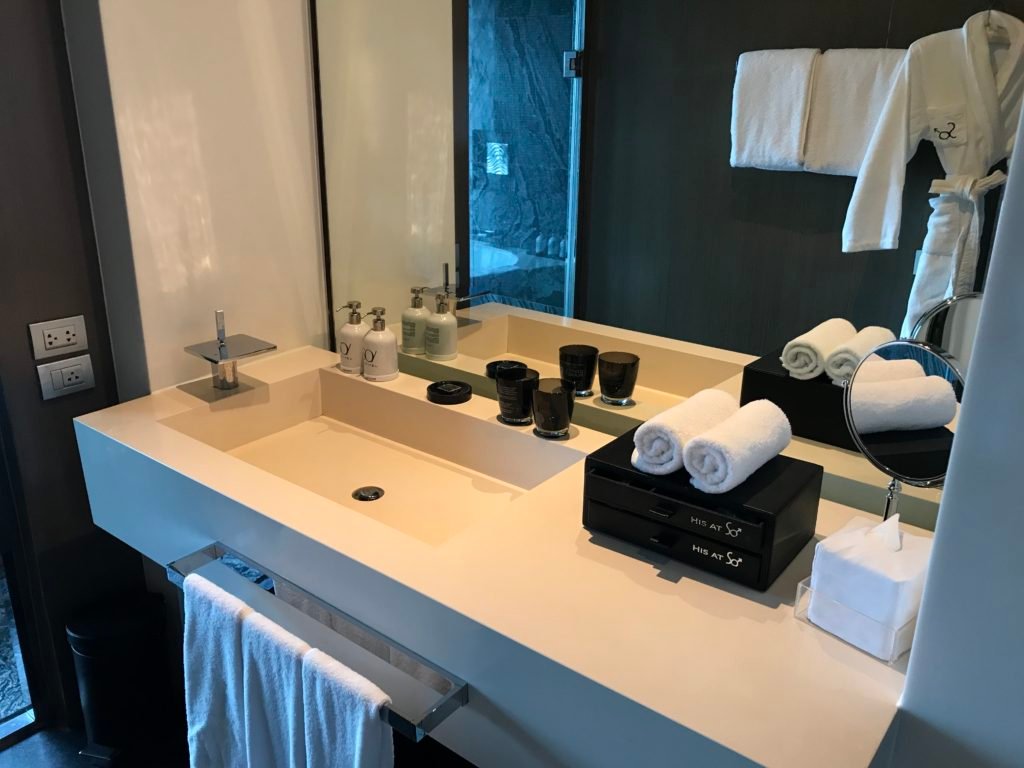 The room included a number of useful perks. This included Apple mini multimedia entertainment, which was particularly good for playing music – with speakers in the bedroom and bathroom. There was also a coffee machine, as well as a complimentary minibar which was stocked with water and juices – a nice addition. The in-room amenities were of an excellent quality too – with separate ‘His’ and ‘Her’ amenities, or in our case, a double set of the first.