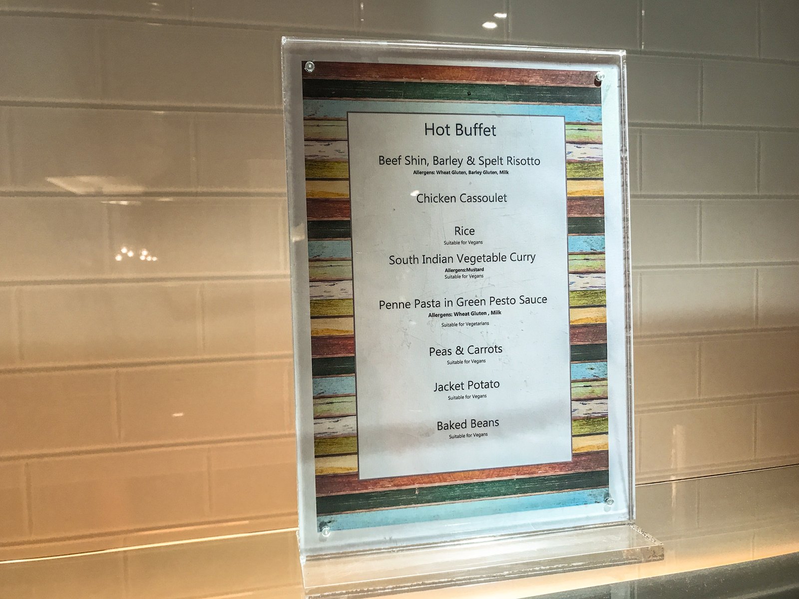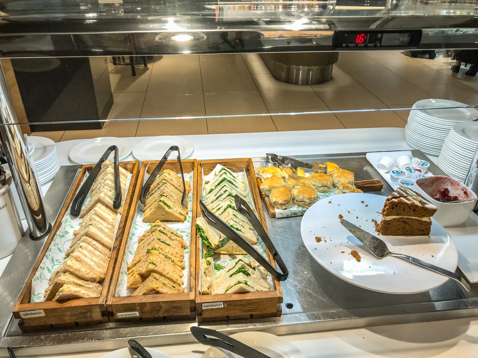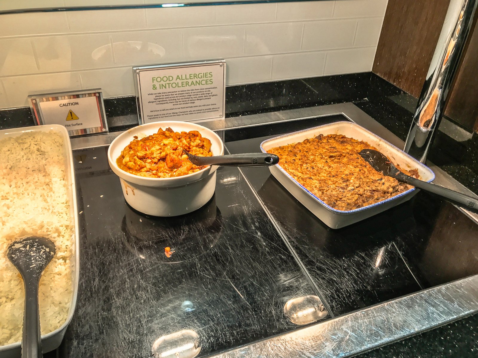 While I prefer the general environment of the Club Lounge, the food is definitely a downgrade compared to the First offering. There is a hot buffet but the food in general is pretty uninspiring. There are also sandwiches and a basic salad bar. BA should improve the catering in their lounges because the current offering is pretty poor and resembles a school canteen more than a lounge. The risotto was particularly vile.